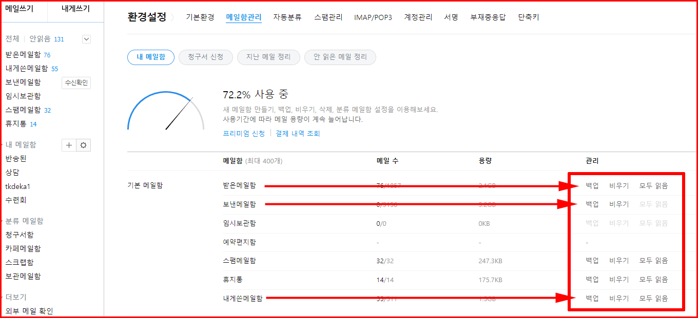 여기서는 '받은 메일함', '보낸 메일함', 그리고 '내게 쓴 메일함' 등이 해당 메일함이군요. 각 항목별로 '백업'을 선택하여 백업을 받습니다.