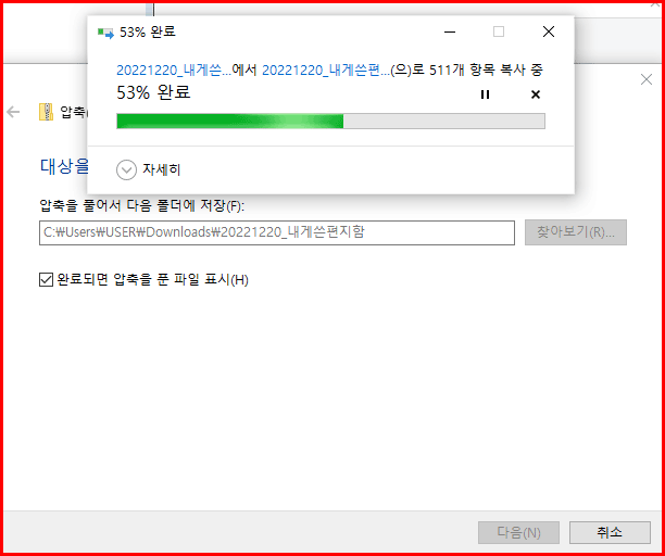 압축을 푸는 폴더는 일반적으로 자신이 저장한 폴더 안에 자동으로 생성됩니다. 여기서는 'Downloads' 폴더에 해당 이름의 폴더를 만들어 푸네요. 압축이 풀리면 파일을 표시하게 했기에 풀림과 동시에 내용을 확인할 수 있습니다.