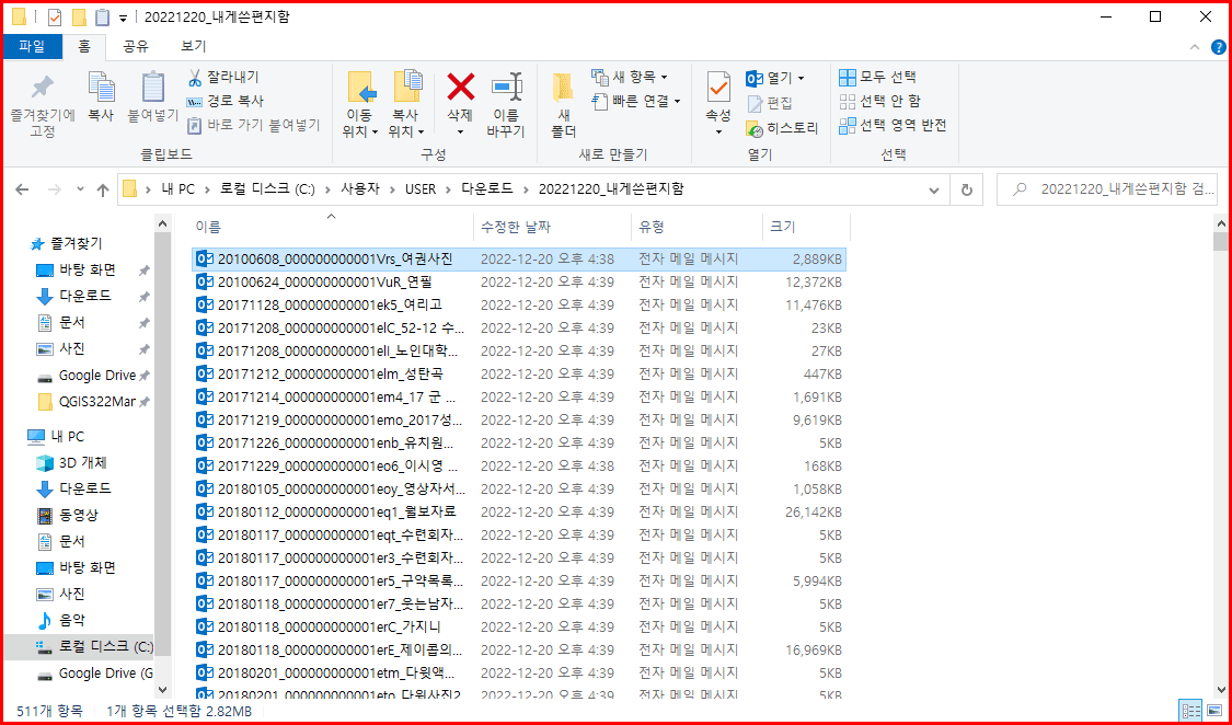 불필요한 파일을 먼저 지웁니다. 필요하지 않은 메일까지 백업할 필요가 없기 때문에 백업 전에 충분하게 검토하고 결정합니다. 모든 사전 작업이 끝나면 아래와 같이 필요한 메일함만 백업을 받습니다.
