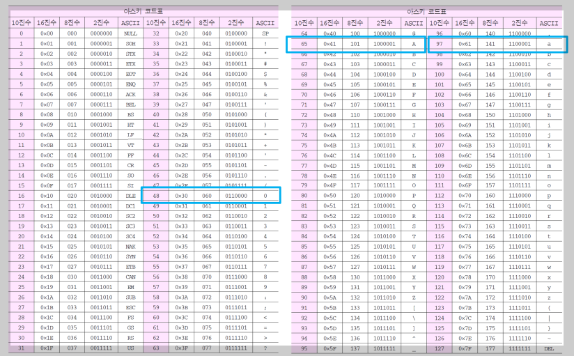 'A'를 8비트로 '01000001'로 컴퓨터가 이해하는 이진수로 약속하는 것입니다. 이진수 01000001은 십진수로 변환하면 '2의 0승 + 2의 6승'이 됩니다. 즉 십진수 65가 아스키 'A'가 됩니다. 소문자 'a'는 8비트로 '01100001'입니다. 십진수로 앞의 대문자 'A'에 '2의 5승' 즉 32를 더하면 되니까 십진수로는 97이 됩니다.
