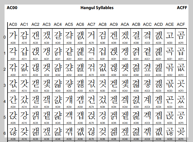 위 이미지는 유니코드 홈에서 한글 표기에 관한 문서 일부입니다. 16진수로 AC00~ACFF까지를 표로 보여주고 있습니다. 이와 같은 방식으로 여러 문자를 컴퓨터에 표현하는 것입니다.