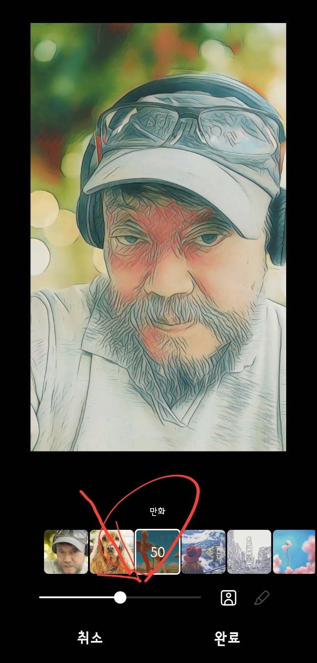 스타일 선택 후에 나타나는 작은 이미지 버튼이 '스타일' 적용 아이콘입니다. 두 번째 '아이콘은 '만화' 스타일입니다. 원본을 만화스럽게 스타일을 적용하는 메뉴입니다.