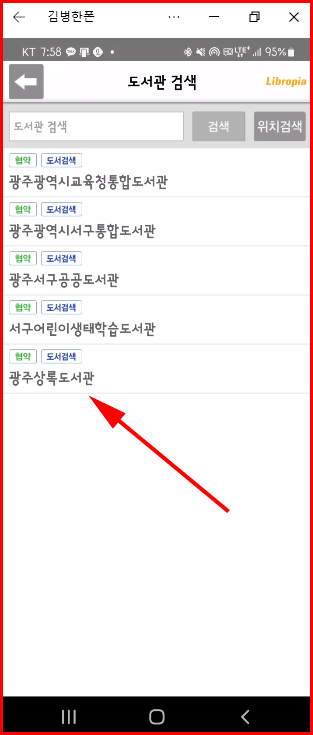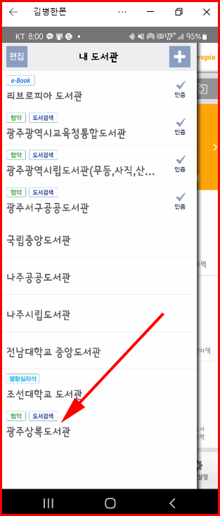 협약 도서관이라는 초록색 버튼이 표시된 '광주상록도서관'은 리브로피아 어플이 적용되는 도서관입니다. 추가는 됐지만 인증을 거치지 않았기 때문에 오른쪽에 파란색 체크 표시와 인증이 나타나지 않습니다. 인증은 도서관에 방문해서 직접 인증 과정을 거쳐야 합니다.
