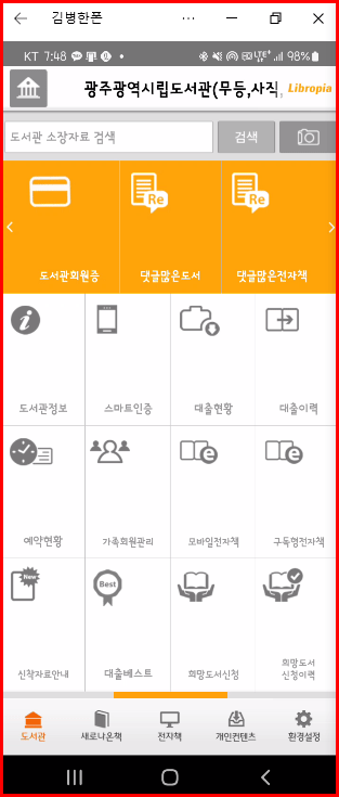 도서관 회원증이 스마트폰에 들어옴으로 해서 불편한 카드 소지를 안 해도 되는 점이 우선 좋은 점입니다. 게다가 각종 도서관과 관련된 서비스를 신속하고 정확하게 파악할 수 있습니다. 게다가 광주광역시립도서관의 경우는 '희망도서바로대출' 서비스를 통해 사용자가 원하는 도서를 신속하게 대출받을 수 있는 좋은 제도를 운영하고 있습니다.