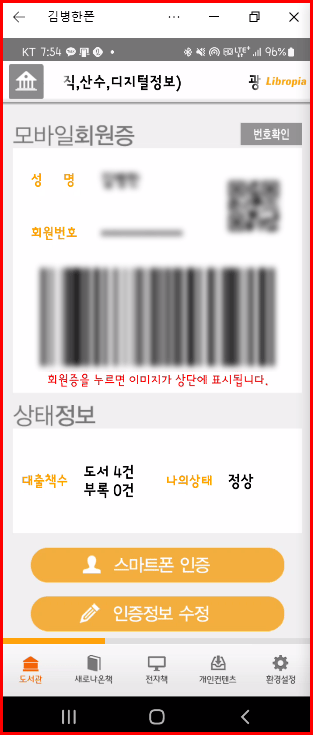 회원증의 생김새는 동일합니다. 성명과 QR코드와 바코드 등이 있어 이것을 이용하여 회원임을 인증합니다. 상태 정보에는 대출책수 등 새로 나온 책 등을 소개하는 메뉴가 있습니다.