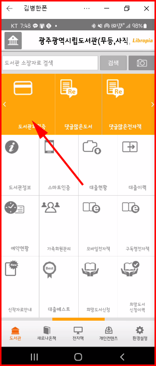 도서관 회원증은 상단의 왼편에 있습니다. 도서관은 지역에 따라 관리 범위가 다릅니다. 광주광역시의 경우는 광주광역시에서 운영하는 도서관과 광주광역시 교육청에서 운영하는 도서관이 있습니다. 그 외에도 몇 개의 도서관 등이 있습니다만 가장 많이 이용되는 도서관 군은 시립도서관과 교육청 도서관입니다.