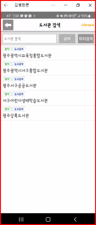 어플을 사용하는 초기에는 도서관 인증을 거쳐야 합니다. 참, 리브로피아 어플을 사용할 것을 협약한 도서관만 앱 사용이 가능합니다. 협약 도서관이 아닌 경우는 도서관 이름을 나오지만 이 어플 사용은 되지 않습니다. 새로 도서관을 추가할 때는 검색 기능을 이용하여 찾아서 해당 도서관을 선택합니다.