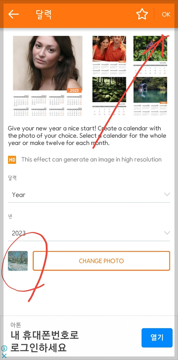 선택된 사진이 아래 왼쪽에 담겼군요. 오른쪽 위에 'OK'를 탭 하면서 달력에 쓰일 사진이 결정됩니다.