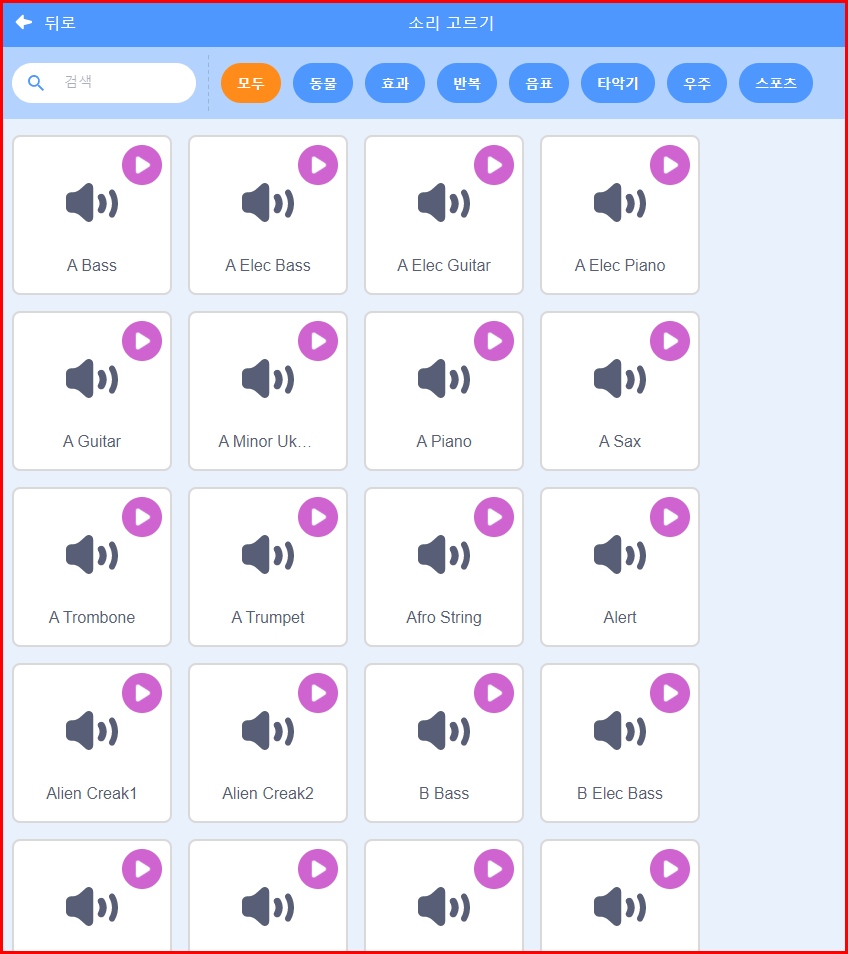 소리 고르기 버튼을 선택하면 아래와 같은 여러 종류의 소리를 고를 수 있는 선택 화면이 나옵니다. '동물', '효과', '반복', '음표', '타악기', '우주', '스포츠' 등의 범주가 있군요.
