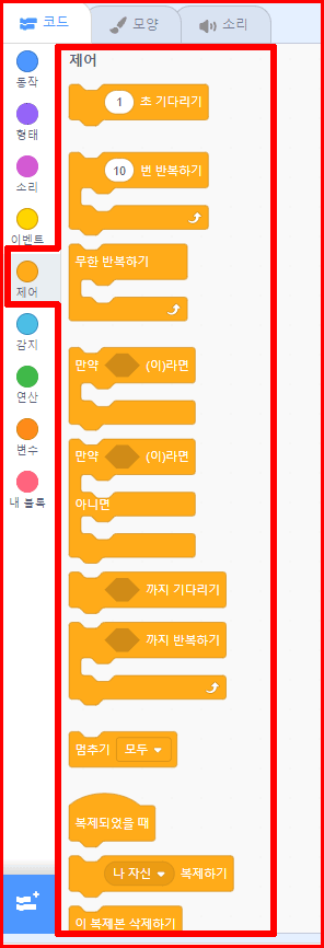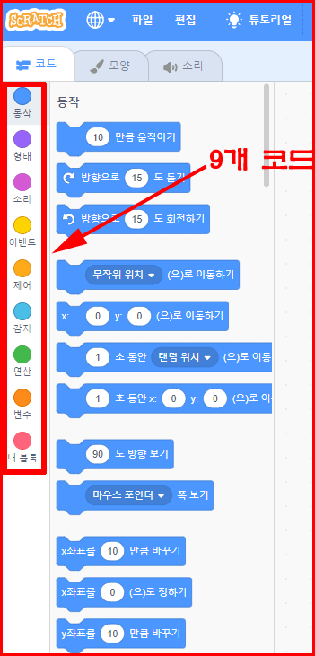 동작, 형태, 소리, 이벤트, 제어, 감지, 연산, 변수, 내블록 순으로 줄줄이 배열되었습니다. 모두 9가지입니다.