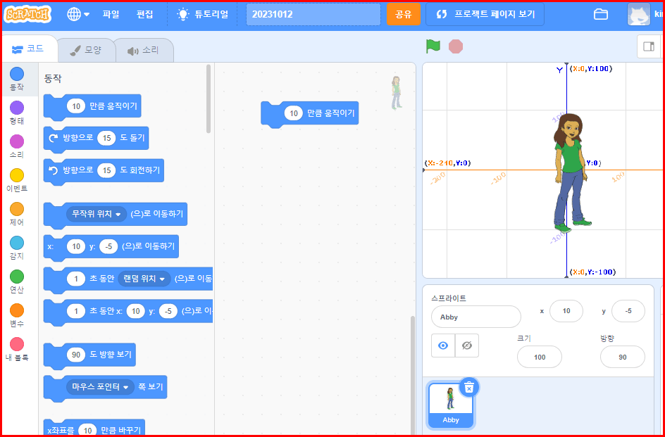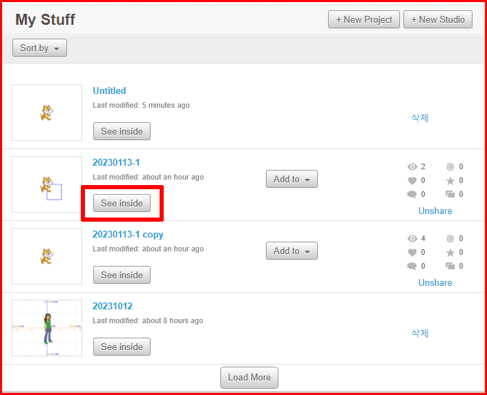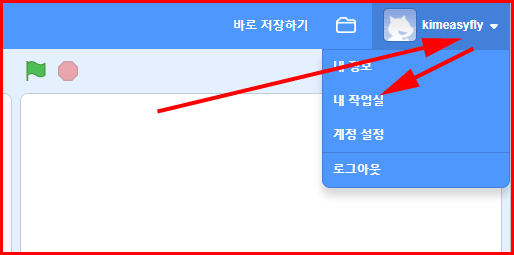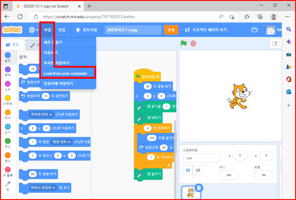 저장된 스크래치 파일을 불러오는 방법을 알아보겠습니다. 클라우드 기반에서는 매 작업 과정에서 클라우드 서버에 저장되기 때문에 '저장'은 큰 의미가 없습니다. 다만 만들어진 프로젝트를 불러오는 것은 의미가 큽니다.