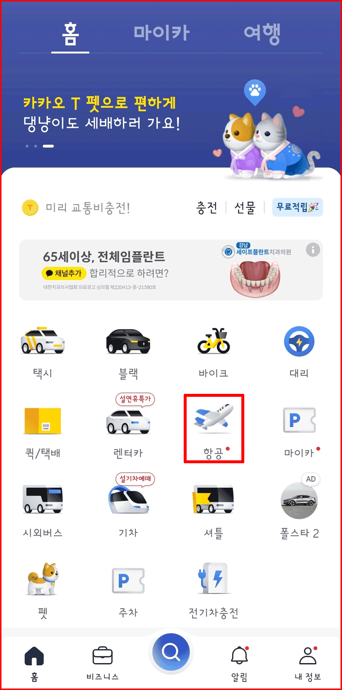 카카오 T에서 비행기 아이콘의 '항공'을 탭 합니다.
