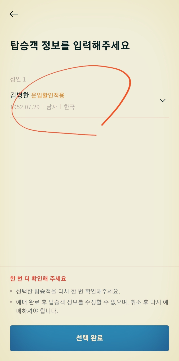 탑승객 정보를 입력하면서 요금과 관련해서 중요한 할인 여부도 적용합니다.