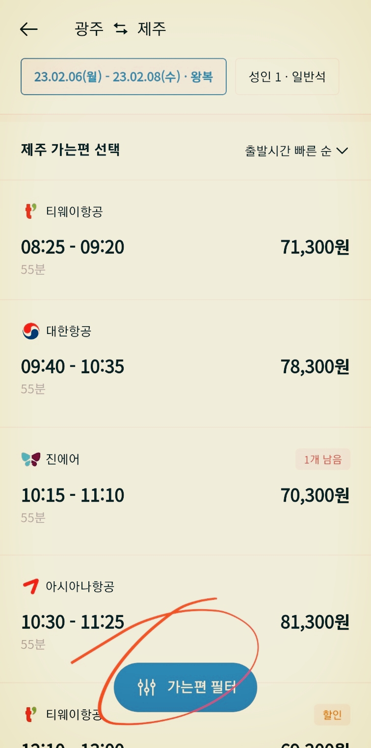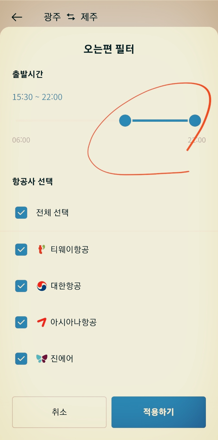 필터링을 합니다. 필터링이란 검색 조건을 구체화하는 것입니다. 항공편은 전체로, 시간의 경우는 가는 길은 오전으로 했습니다.