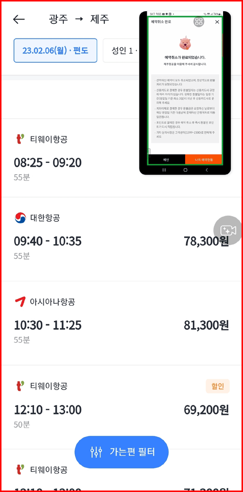 광주에서 제주 가는 항공권 예약 사례