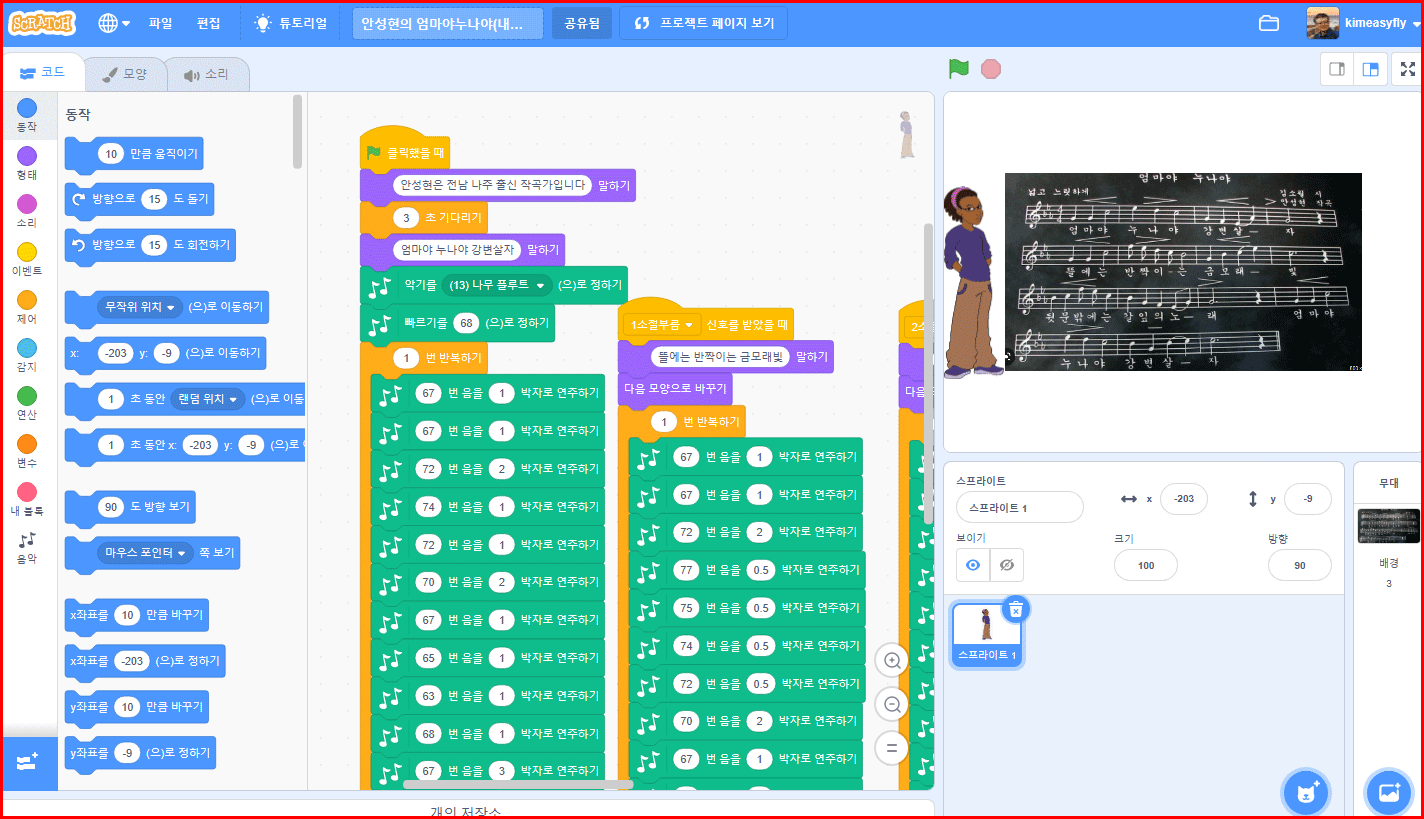 완성된 코딩은 프로젝트에서 볼 수 있습니다. 초록 깃발을 클릭하면 시작되고 빨간 원을 선택하면 중지합니다. 이 프로젝트에서는 깃발을 클릭하면 안성현의 소개가 간단하게 나오고 3초 후부터 음악이 시작됩니다. 악기는 피아노로 했고 빠르기 '68'로 설정했습니다. '넓고 느릿하게' 부르라는 악상 표시에 따라서.