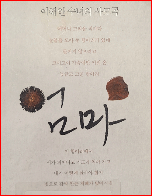 수녀님은 어머님과 주고받은 편지와 엄마를 그리는 시들 중에 마지막 시가 '눈물 항아리'입니다. 시는 다음과 같습니다.