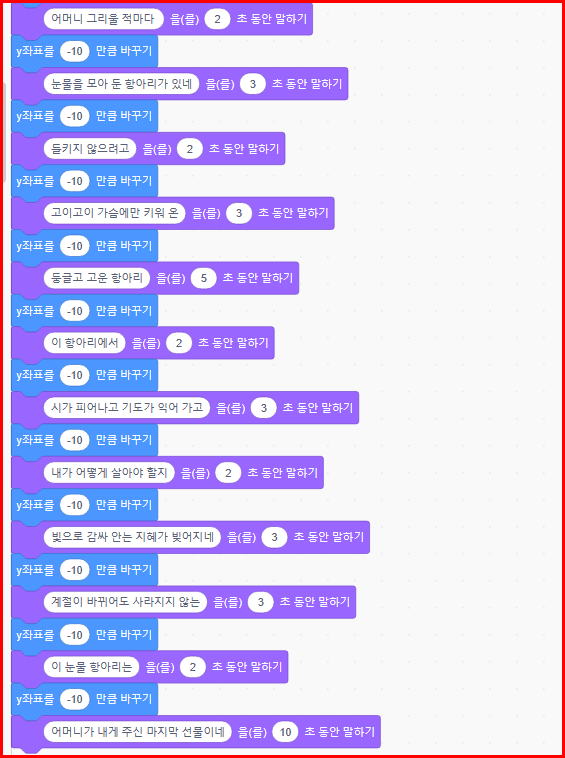 3초 정도 기다리다가 시를 본격적으로 진술했습니다. 같은 위치에서 시구가 진술되는 것은 너무 평범할 것 같아 스프라이트를 10픽셀만큼 아래로 이동하면서 디스플레이되도록 했습니다.