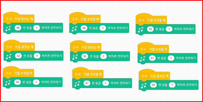 스크레치는 이벤트에 의해 프로그램은 작동됩니다. 일반적으로 깃발을 클릭하면 멜로디 연주가 시작됩니다. 음악 연주 중에 숫자 키를 누르면 화음이 연주되게 했습니다.