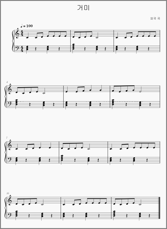악보는 뮤즈스코어로 작성했습니다. 스크래치 배경으로 사용된 악보 이미지는 무대 사이즈에 맞춰 이미지 크기를 '480 × 360'으로 했습니다. 옆으로 늘어나서 볼품은 없네요.