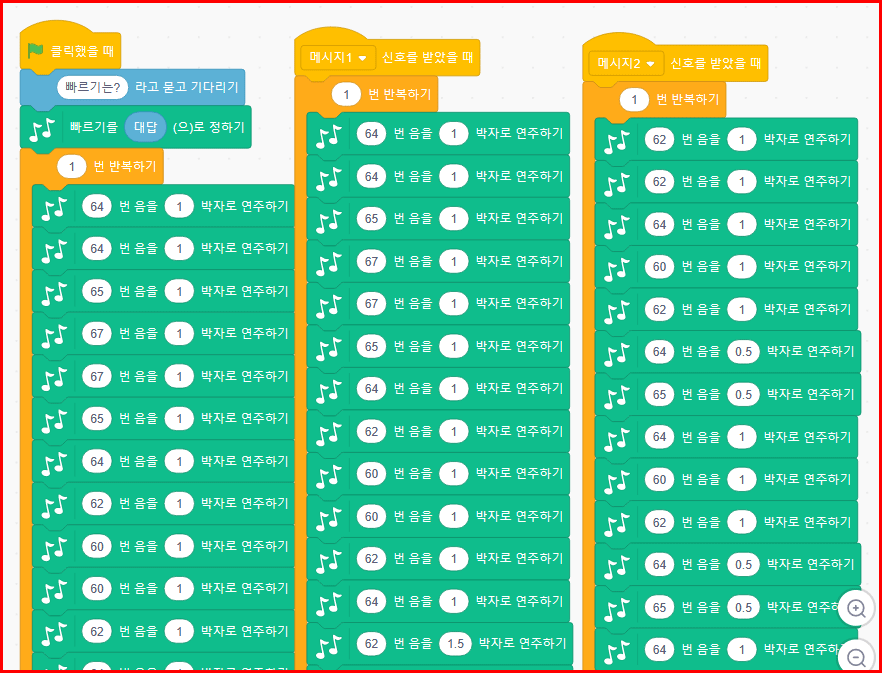 각 소절별로 잘라서 코딩했습니다. 한 소절이 끝나면 메시지를 보내고 받은 메시지를 통해 다음 소절이 이어지게 한 것입니다. 물론 한 번에 쭈욱~ 코딩할 수도 있겠으나 공간 여건도 있고, 잘라서 연결하는 것이 나중에 수정할 때도 좋습니다. 메시지를 이어가는 것은 간단합니다. '새 메시지 만들기'를 계속하면서 진행하면 되니까요.