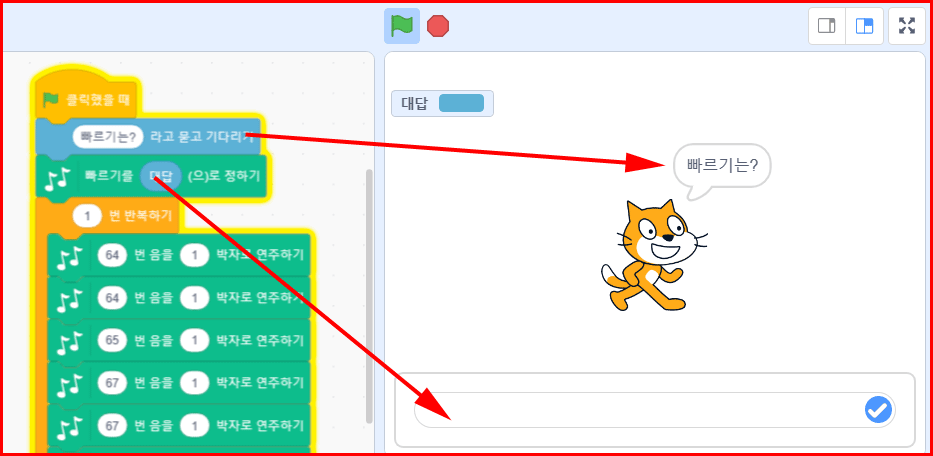 스크래치 패널에는 '감지' 블록있습니다. 그중에는 인터렉티브하게 진행할 수 있습니다. '빠르기는?' 하고 묻고 입력을 기다립니다. 숫자로 빠르기를 정해주는 것입니다.