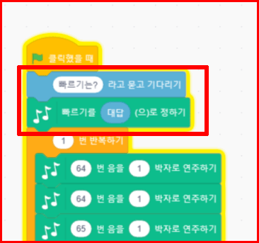 환희의 송가 코딩에서 중요한 사항 하나는 연주 빠르기를 사용자가 직접 선택할 수 있게 한 것입니다. 선택은 숫자를 입력함으로써 해결됩니다. 스크래치 프로그램을 실행하면 바로 '빠르기는?'이라고 물어옵니다. 스크래치 '감지' 기능을 이용해서 인터렉티브가 가능한 코딩을 하는 것입니다. 숫자는 얼마든지 입력이 가능합니다. 사람은 불가능한 빠르기도 컴퓨터는 해결하니까요. 스마트폰은 손안에 있는 컴퓨터입니다.