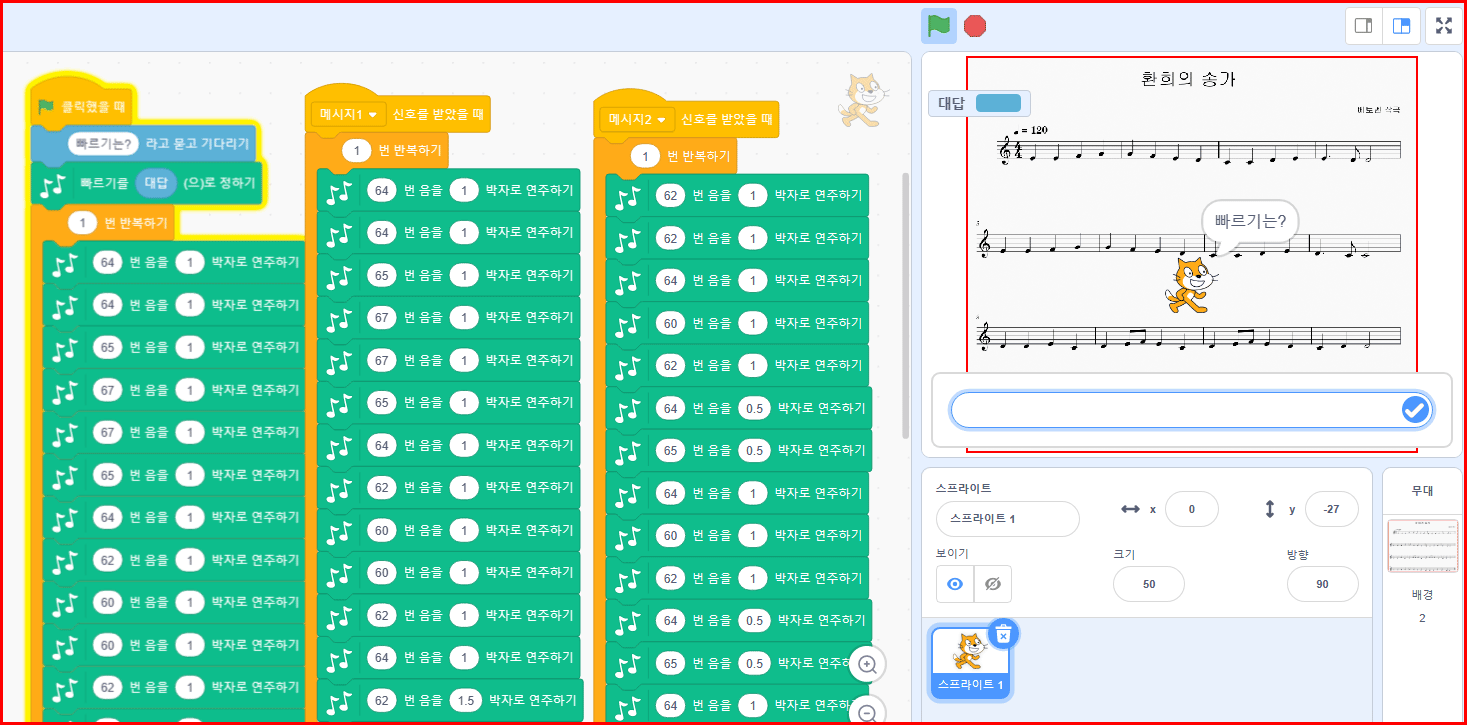 오늘은 베토벤의 교향곡 9번의 일부인 '환희의 송가'를 템포를 사용자가 직접 입력하여 여러 빠르기로 체험할 수 있는 스크래치 프로젝트를 보여 드리겠습니다.
