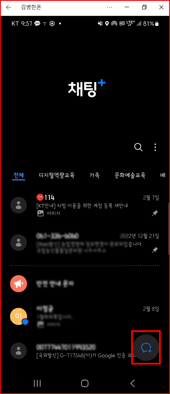 1. 메시지(문자) 어플을 엽니다. 아래에 나타나는 '구름무늬 대화창+'를 선택합니다.(기종에 따라서 다를 수가 있습니다.)