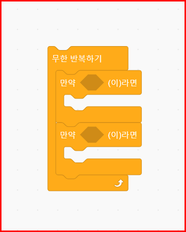 여기 사용될 반복 구조는 '무한 반복'입니다. 프로그램 끝낼 때까지 반복하는 것입니다. 프로그램 끝내는 것은 빨간색의 정지 버튼입니다.