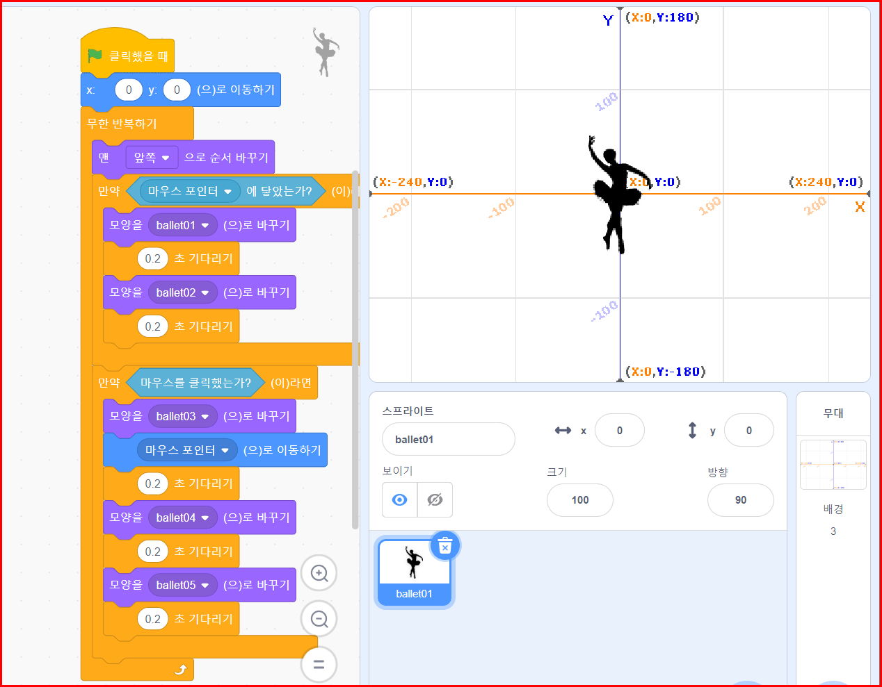 마우스를 스프라이트에 가져다 대면 발레 동작을 하도록 코딩합니다. 마우스를 클릭하면 세 가지 발레 동작을 보여줍니다. 마우스를 드래그하면 마우스를 따라 발레리나가 움직입니다.