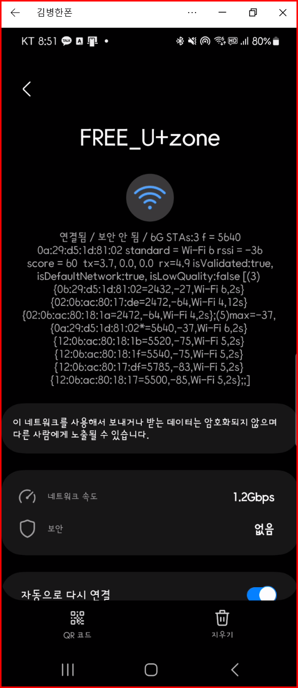 스마트폰 와이파이는 글을 작성하는 현재 U+zone을 사용하는데 네트워크 속도가 1.2Gbps군요. 이 정도면 제가 사용하는 데이터 기반의 핫스팟보다는 훨씬 좋습니다.