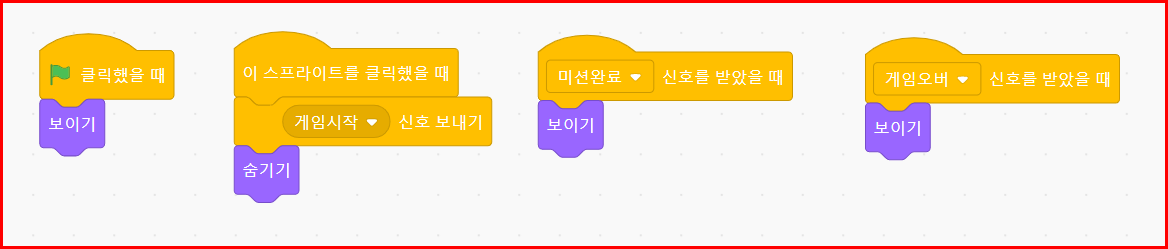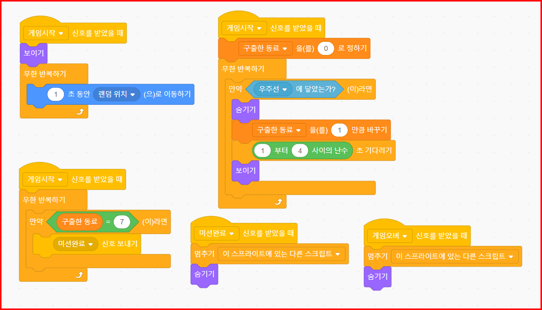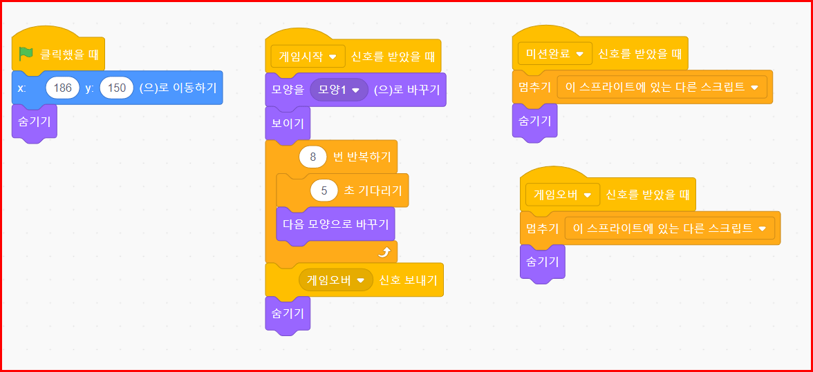 타이틀이 세 개 있습니다. '구출하기', '미션 성공', '게임 종료' 등. 타이틀 스프라이트 모양 편집에서 타이핑하여 만듭니다. 있어 보이려고 영어도 썼습니다. 한글이 폰트가 다양하지 못해서요.