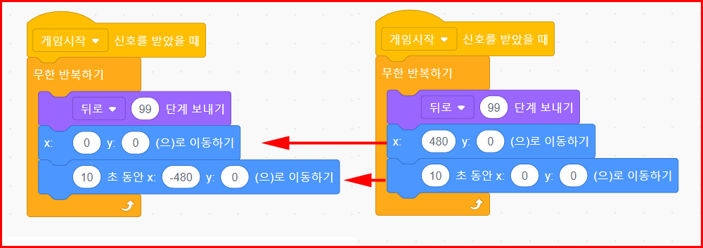 여기서 중요한 축은 x축입니다. y축 변화 없이 x축만 계속 바뀝니다. 10초에 480픽셀을. 초당 48픽셀의 움직임이 계속되는 거죠. 첫째 우주 스프라이트가 왼편으로 밀려가면 두 번째 우주 스프라이트가 빈 공간을 채우면서 밀어붙이기 때문에 계속 이어집니다.