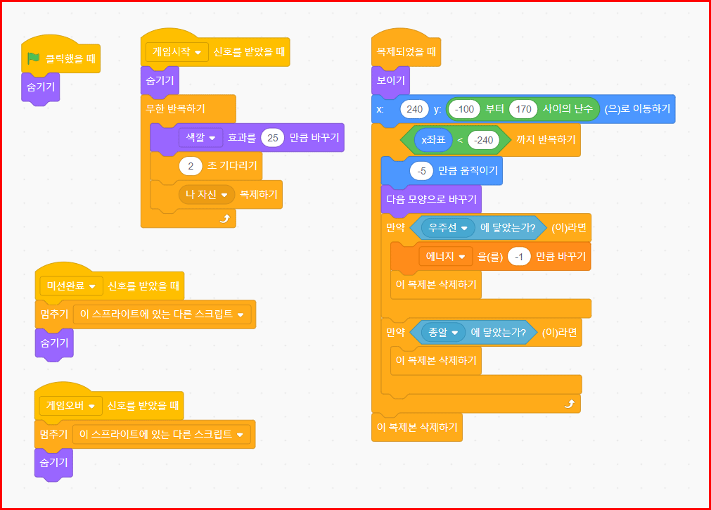우주 배경은 열심히 쉬지 않고 움직입니다. 왼쪽에서 오른쪽으로 흘러가게 하는 것은 배경 무대로는 안됩니다. 스프라이트 2개가 이어지면서 움직임을 계속합니다.