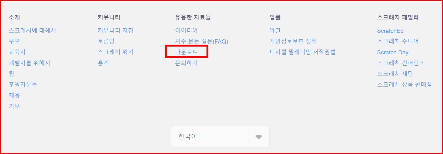 스크래치 홈페이지 하단에 '유용한 자료들/다운로드' 항목이 있습니다. 이곳을 클릭하면 각종 플랫폼에서 오프라인 상태의 스크래치를 즐길 수 있는 프로그램 다운로드가 가능합니다.