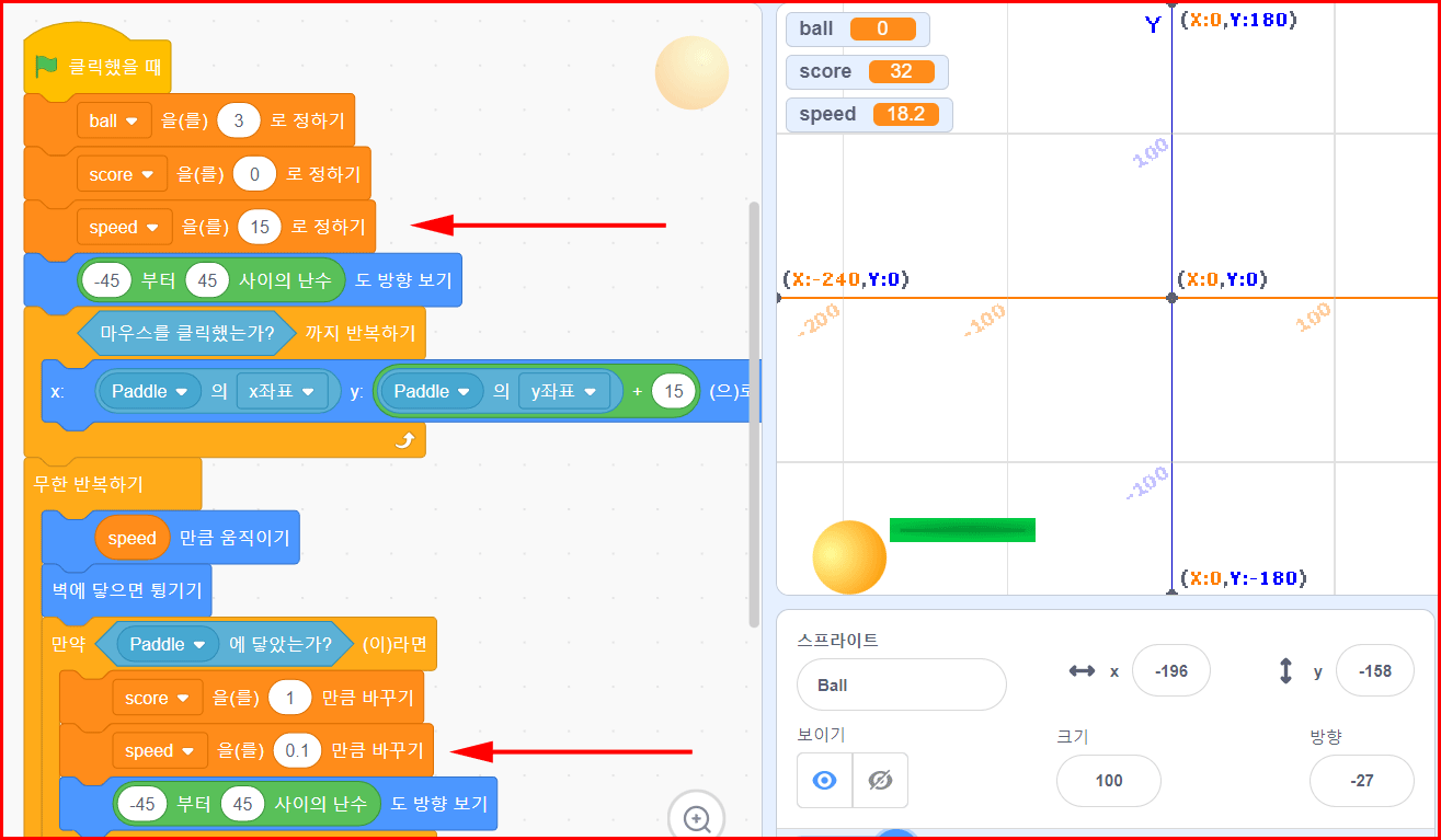 스크래치 스쿼시 공에 속도 변수를 준다면