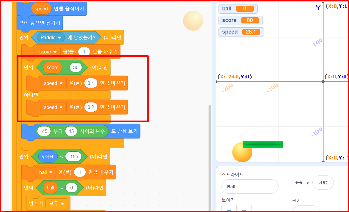 패들에 공을 맞출 때마다 속도를 조금씩 올려주는 것입니다. 1점 올라갈 때마다 0.1의 속도가 증가하다가 점수가 30점이 되면 0.2로 증가한다면 어려운 게임이 될 것입니다.