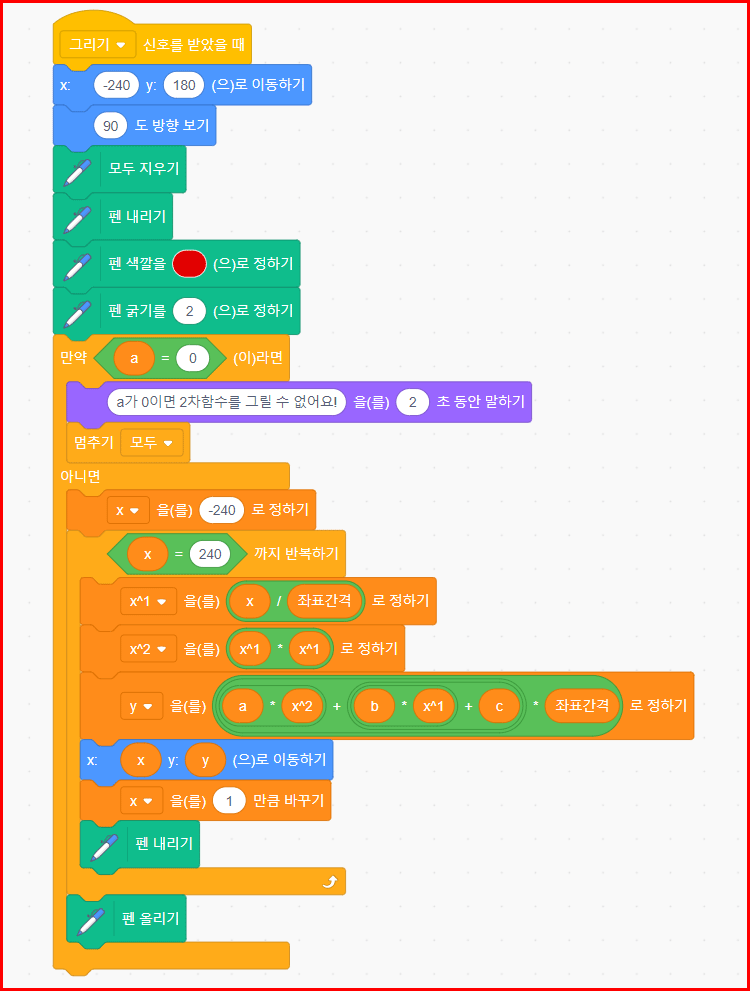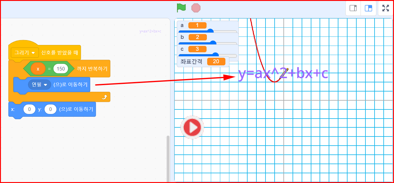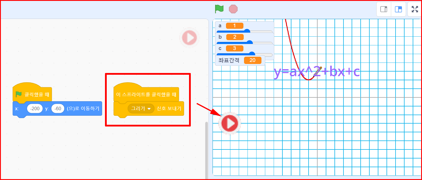 변수 a, b, c를 조정해서 받아들일 수 있게 하기 위해 깃발 클릭으로 바로 시작하지 않고 변수값을 조정하는 시간을 갖기 위해 '그리기' 버튼을 사용합니다.