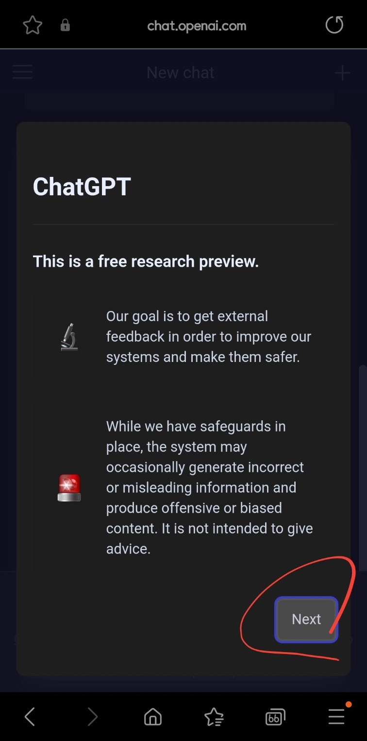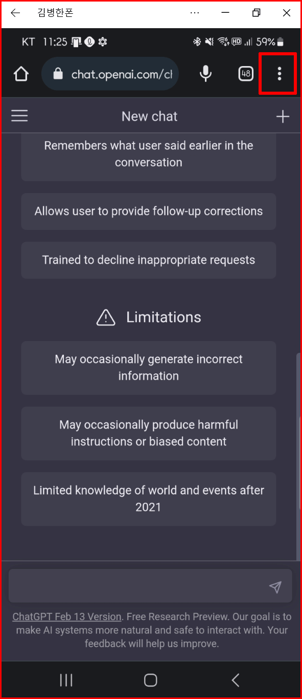홈화면에 배치하기 위해 브라우저 화면에서 'chat.openai.com'을 입력한 다음 화면에서 '삼 점 더 보기'를 선택합니다. 점 세 개는 주로 더 많은 정보를 보여줍니다.