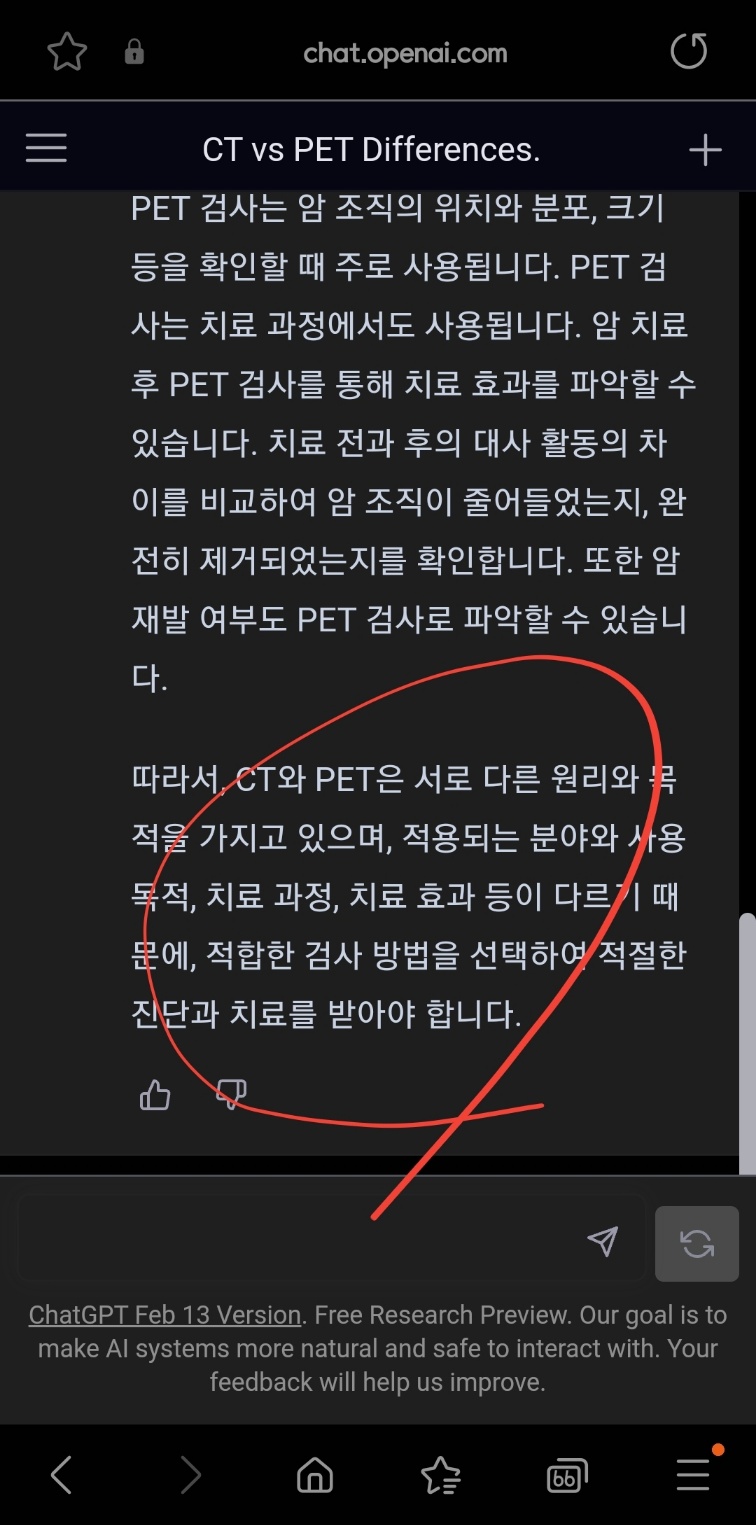 "CT와 PET의 차이를 치료 과정과 치료 효과를 중심으로 소개해 주세요?"라는 질문을 했습니다. 깜박이면서 대답을 하는데, 이런 전문적 소견은 대답이 정확합니다.