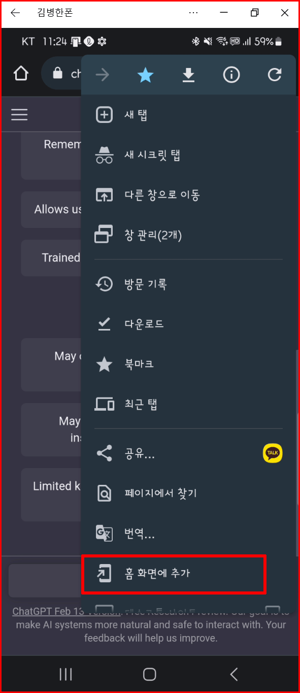 많은 메뉴 가운데에 '홈 화면에 추가'가 있습니다. 이것은 현 상태의 브라우저를 그대로 아이콘으로 만들어 스마트폰 홈 화면에 추가를 합니다. 그 아이콘만 추가하면 바로 ChatGPT를 사용할 수 있게 합니다.