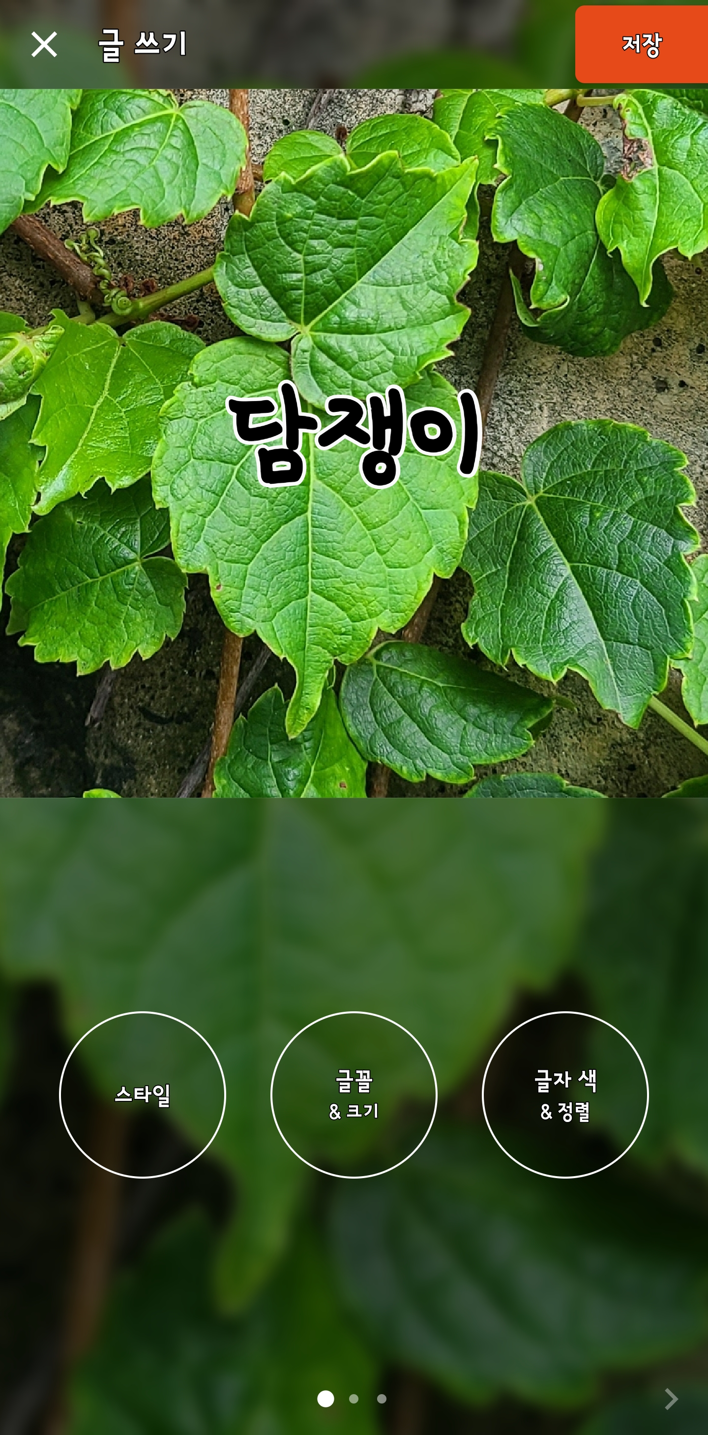 확인을 하면 글의 스타일, 글꼴, 글자색 등을 조정할 수 있는 버튼이 아래에 배치됩니다. 또한 버튼은 화면을 오른쪽으로 스크롤하면 글효과, 서명, 날짜, 글추가 등의 버튼이 있습니다.