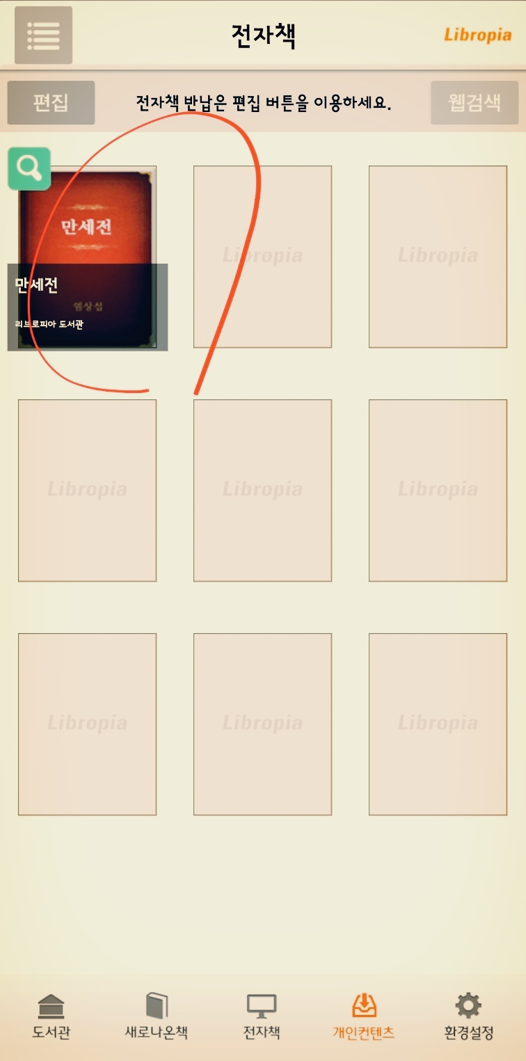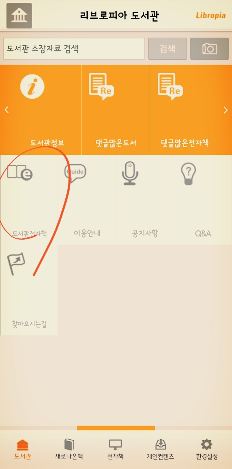 기본은 '리브로피아 도서관'입니다. '도서관 전자책'을 선택합니다. 또는 아래 '전자책' 탭을 선택해도 마찬가지입니다.