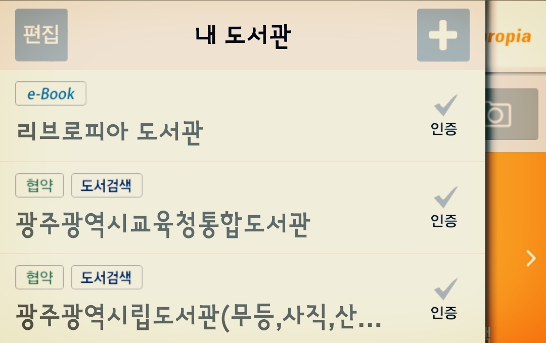 기본 서비스는 전자책(e-Book) 서비스입니다. 리브로피아 좌상단 도서관 아이콘을 선택하면 등록한 도서관 목록이 나웁니다. '협약'된 도서관은 '협약' 마크가 걸려 있습니다.