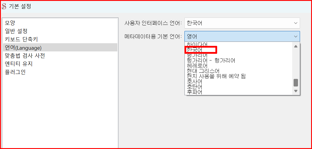 시길의 기본 언어와 EPUB의 메타데이터 언어를 설정합니다. 제작한 EPUB 전자책의 내용을 구성하는 언어가 어떤 언어인지를 알려주는 정보이기 때문에 아주 중요합니다. 언어 설정이 잘못되어 있으면 뷰어에서 글자가 깨질 수 있습니다. 특히 iBooks나 구글 Play 북에서 한국어 책을 서비스하려면 반드시 메타데이터의 언어를 한국어로 설정해 줘야 합니다.