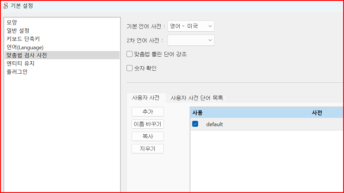 한국어 언어 사전이 지원되지 않아 그대로 영어를 사용합니다. 대신, '맞춤법 틀린 단어 강조'는 사용하지 않습니다. 등록된 한글 언어 사전이 없기 때문에 의미가 없습니다.