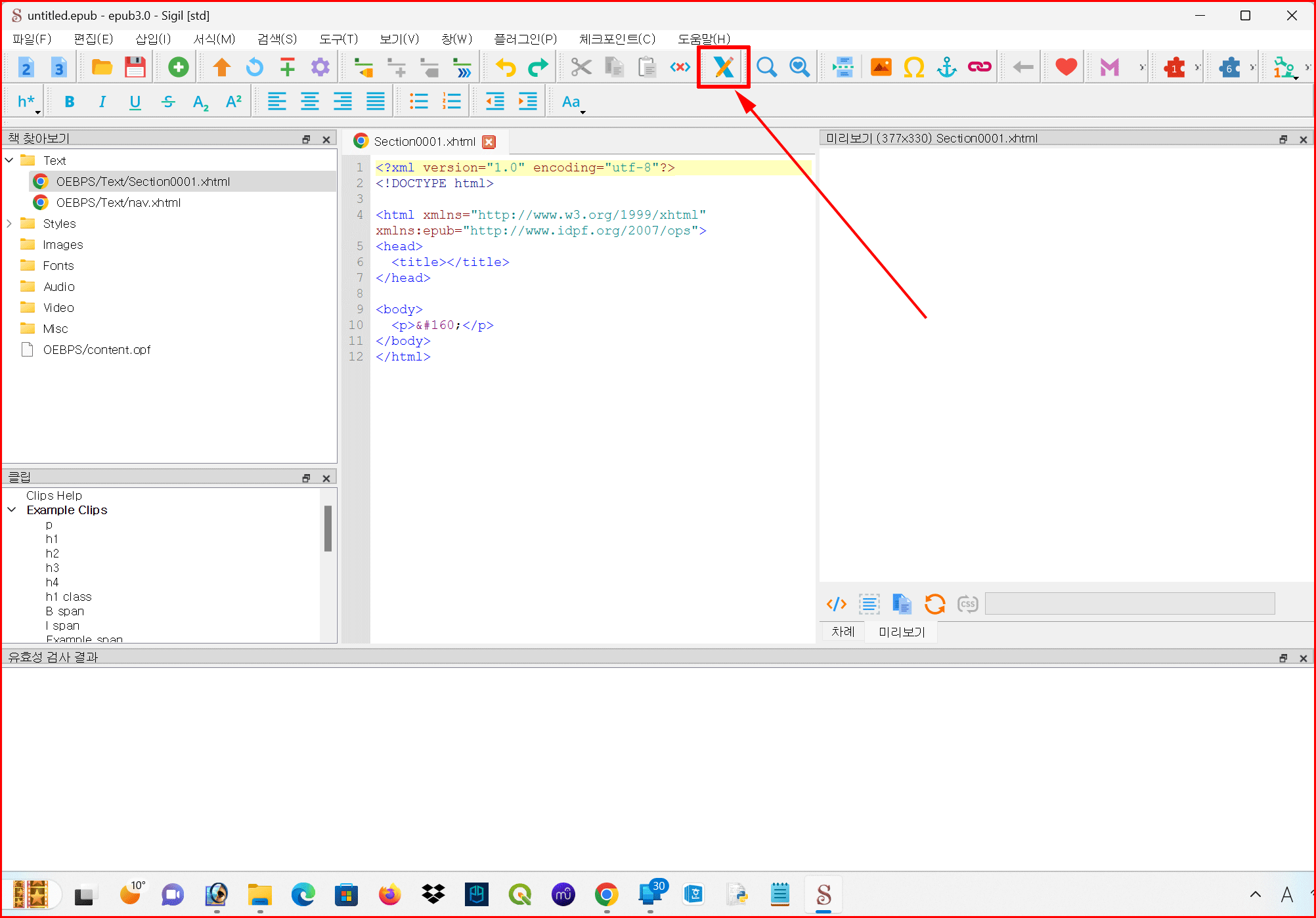 Sigil을 설치할 때 같이 인스톨했던 '페이지에디트'가 그 프로그램입니다. 프로그램 Sigil 환경 설정에서 연동을 했습니다. 아래 그림에서 [X]자 도구가 그것입니다.