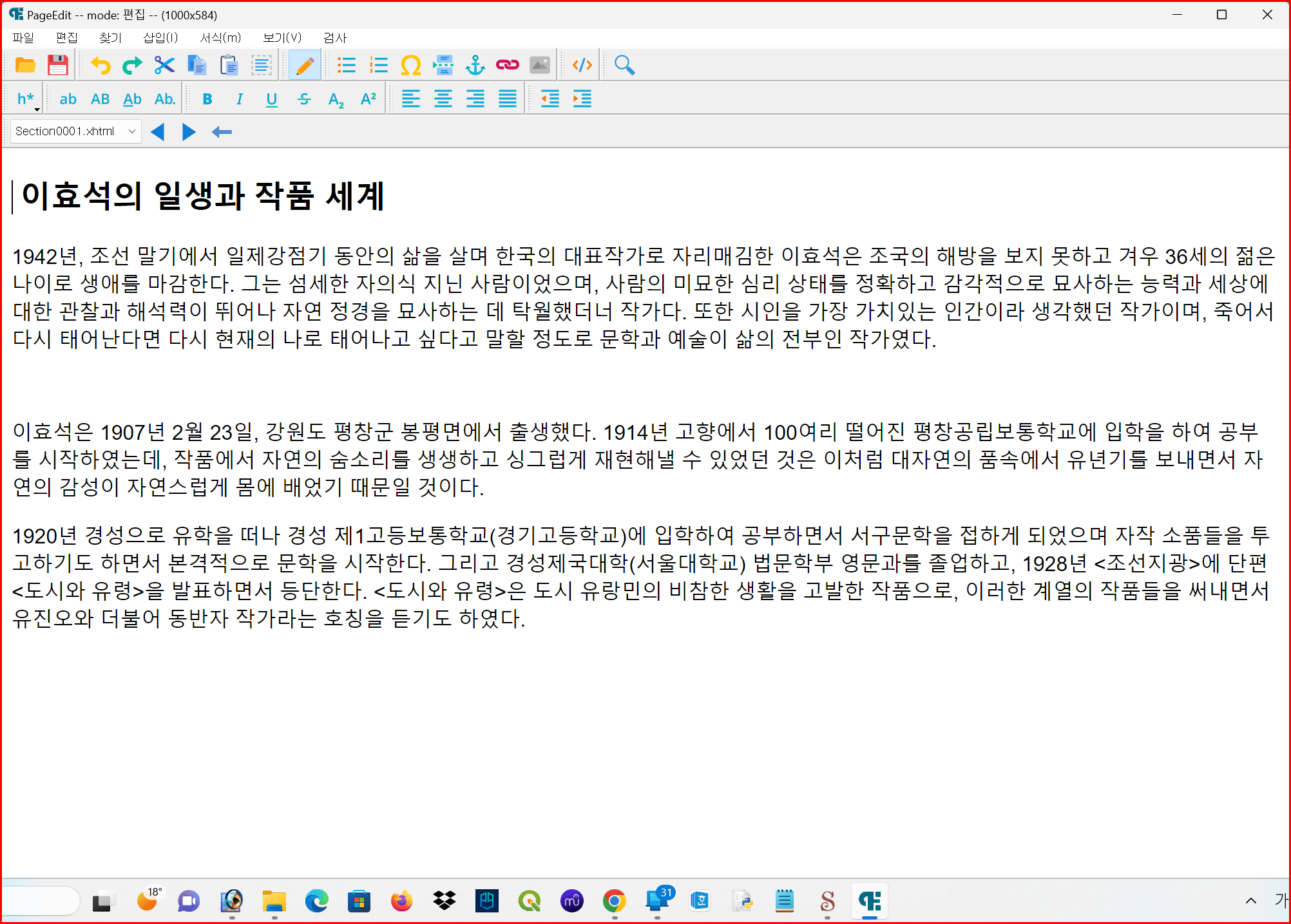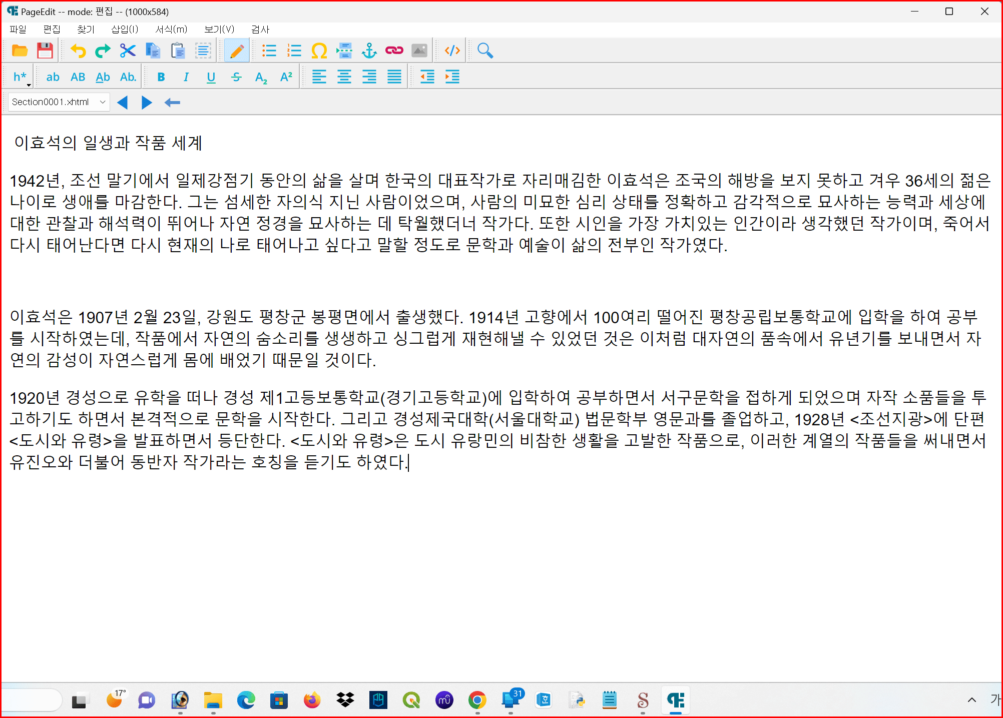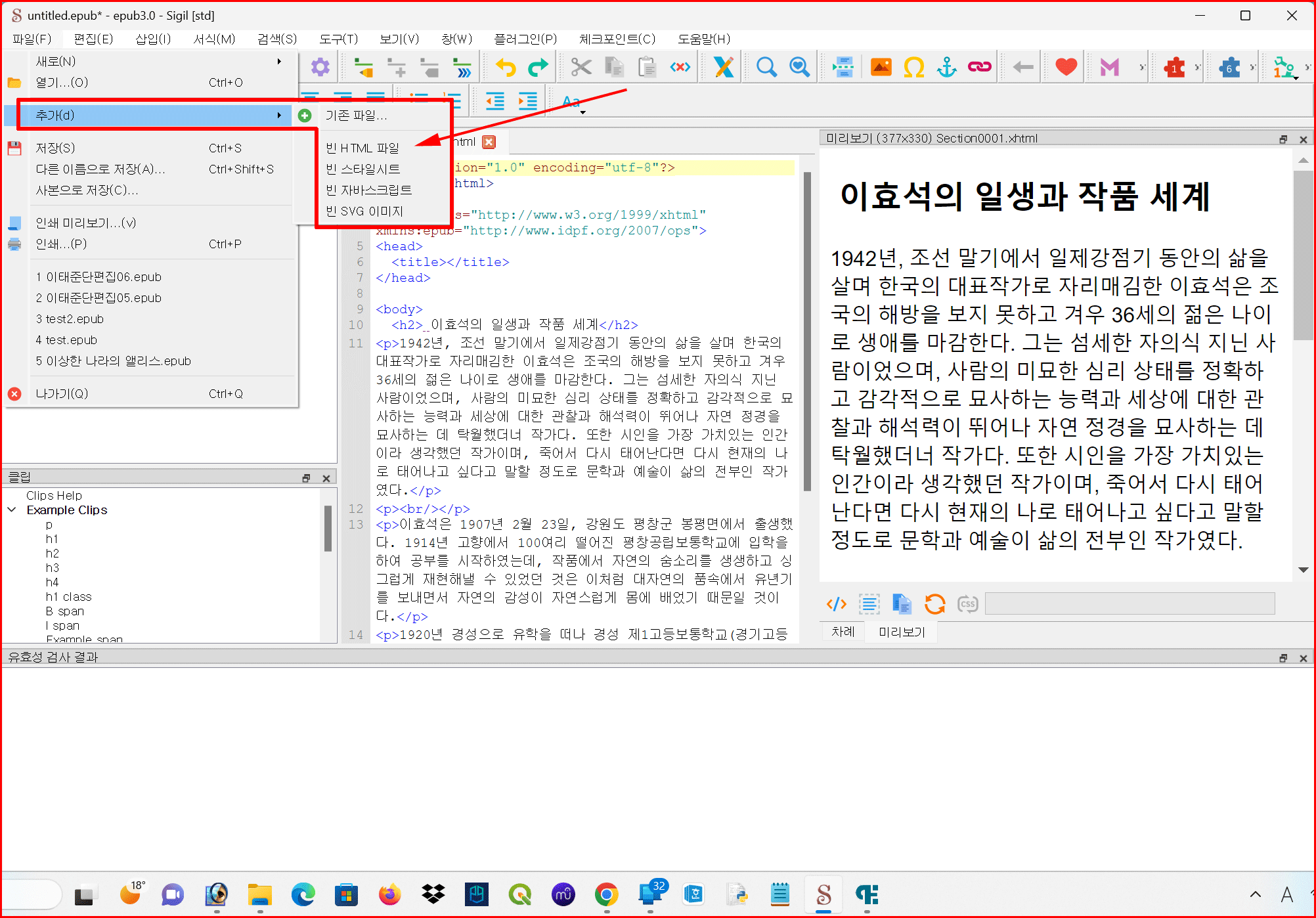 지금까지 작성한 전자책을 저장합니다. 다음 작업을 할 때, 저장된 전자책 문서 '이효석단편집.epub'를 불러내서 이어 작업을 진행하면 됩니다.