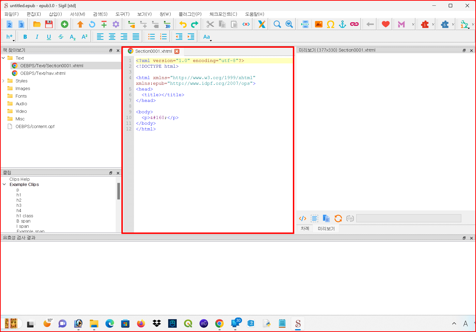 Sigil에서 전자책을 편집하는 공간은 화면 가운데 편집창(아래 그림의 빨간 테두리)입니다. 이곳은 HTML 언어를 알아야 작성할 수 있기 때문에 Sigil은 편집툴을 연결해서 사용할 수 있게 합니다.